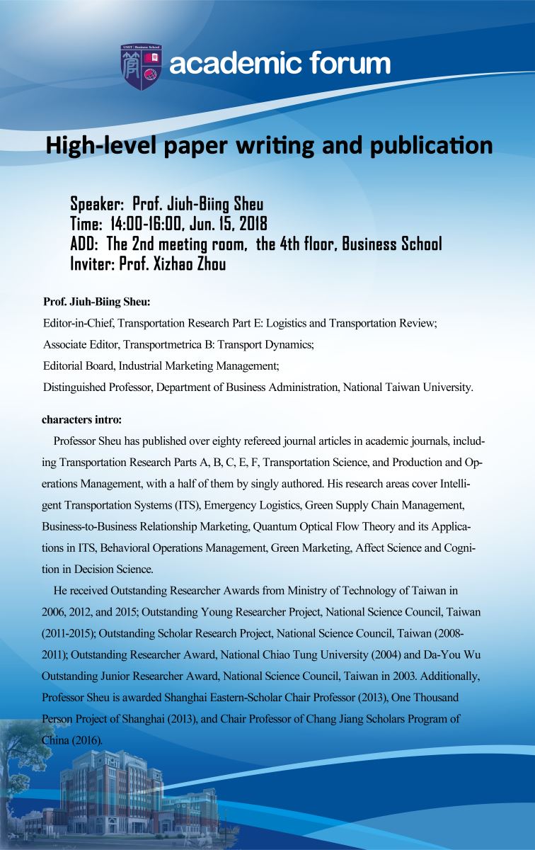 Professor Sheu has published over eighty refereed journal articles in academic journals, including Transportation Research Parts A, B, C, E, F, Transportation Science, and Production and Operations Management, with a half of them by singly authored. His research areas cover Intelligent Transportation Systems (ITS), Emergency Logistics, Green Supply Chain Management, Business-to-Business Relationship Marketing, Quantum Optical Flow Theory and its Applications in ITS, Behavioral Operations Management, Green Marketing, Affect Science and Cognition in Decision Science.
