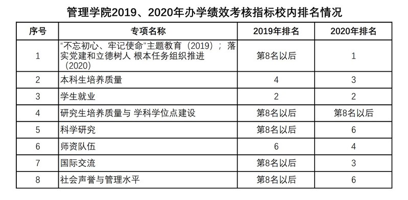 管理学院2019、2020年办学绩效考核指标校内排名情况