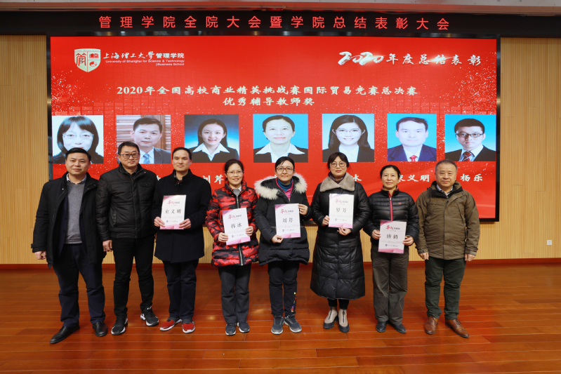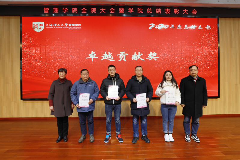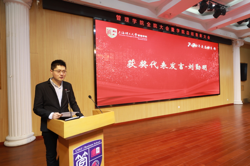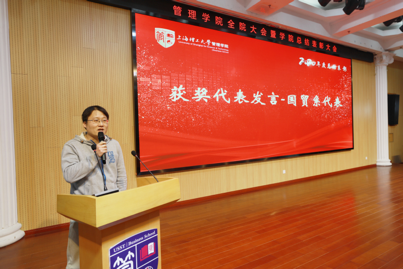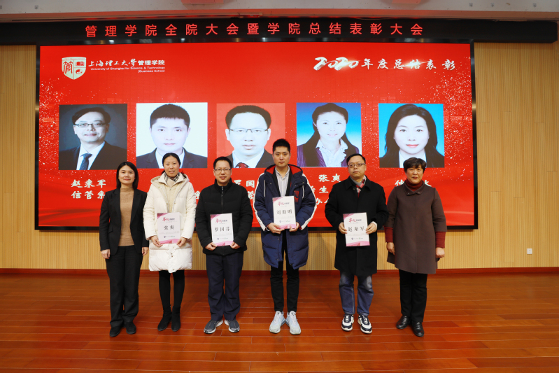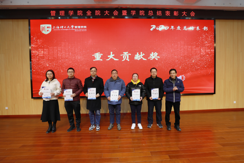 为表彰过去一年在学院各个领域中作出突出贡献的先进集体和个人,号召全院师生向先进学习,助力学院发展再上新台阶,学院向系统科学系、学生工作办公室、赵来军、葛玉辉、韩承鹏、罗国芬授予了“重大贡献奖”;向工商管理系、国际经济与贸易系、学生工作办公室、专业学位教育中心、赵来军、刘勤明、罗国芬、张爽、仲伟冰、罗芳、赖红波、刘芹、唐俏、韩冰、束义明、杨乐授予了“卓越贡献奖”;向工商管理课程思政领航团队等11个集体、卞泽阳等60位教师个人授予了“突出贡献奖”;向党政综合办公室等5个集体、陈进等47位教师个人授予了“优秀贡献奖”;向党政综合办公室等4个集体授予了“优秀管理服务奖”;向王瞿建、陈露以及房志明等8人分别授予了“优秀党务工作者”和“优秀共产党员”荣誉称号。国际贸易系何文老师、工业工程系刘勤明老师作为获奖团队和个人代表发言。