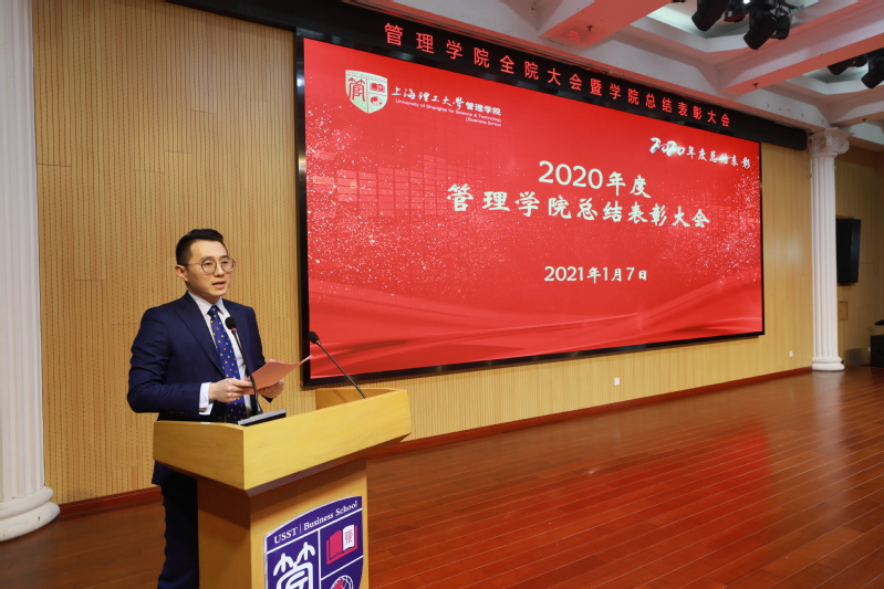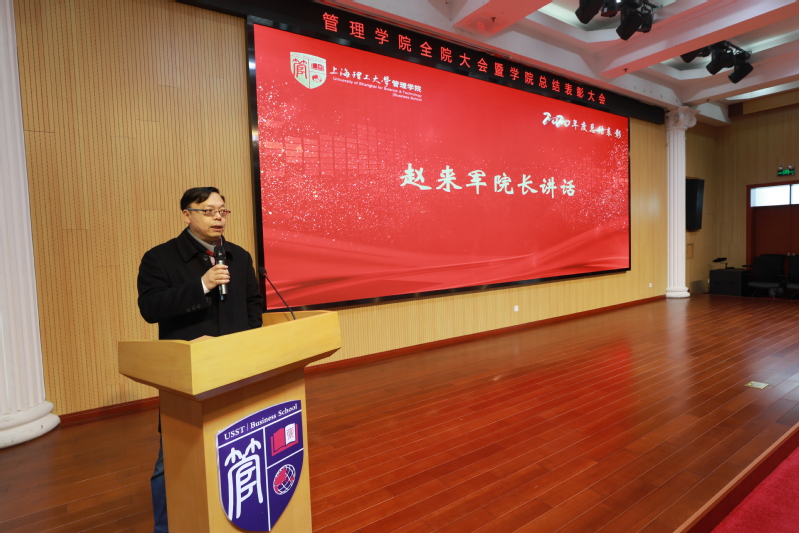 赵来军院长首先对2020年学院工作进行总结。他代表学院班子成员对全院教职工的辛勤付出表示感谢。在全院师生的共同努力下,2020年学院各项事业都获得了快速发展。管理学院在全校15个接受考核的学院中,全部8项考核指标4项位居前3,7项位居前6,与2019年相比进步显著。他希望2021年全院教职工能继续小步快跑,为建设国际一流精英商学院不懈努力。最后,他对期末和寒假的工作安排进行了部署。