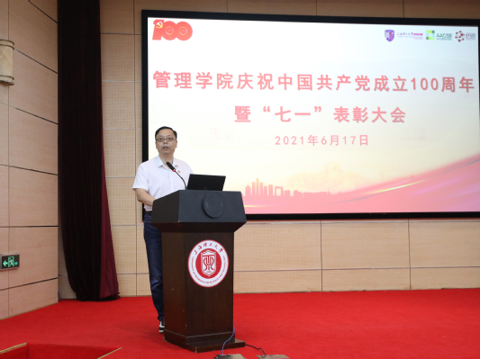 2021年6月17日下午13:30,管理学院在综合楼报告厅举行庆祝中国共产党成立100周年暨“七一”表彰大会。校党委副书记、副校长盛春,党委组织部副部长李琴,管理学院党委书记汪维,党委副书记、院长赵来军,党委副书记蒲莹莹出席本次大会,各党支部支委成员、受表彰的优秀党员、优秀党务工作者、先进基层党组织代表、师生党员代表参加表彰大会。表彰大会由赵来军主持。