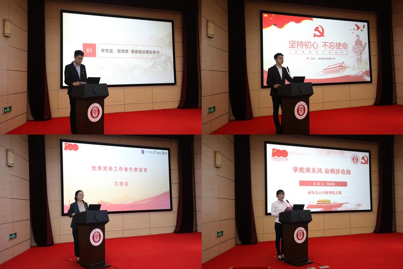 盛春向受表彰的优秀党员、优秀党务工作者和先进基层党组织表示热烈的祝贺。他指出,在党百岁生日来临之际举办这样的活动非常有意义。回顾历史,展望未来,庆祝这一路走来我们党所取得的丰功伟绩,同时树立典型,激励作为,扬帆起航再出发。管理学院党委在服务人才培养、科学研究,服务学院和学校的发展上发挥了重要的引领作用,牢固树立以师生为本的发展思想,为师生办实事方面也做了大量的工作。他希望党员同志们,以典型为榜样,学好党的历史,记好党的宗旨、记牢党的使命。最后,由盛书记领誓,全体党员重温了入党誓词。