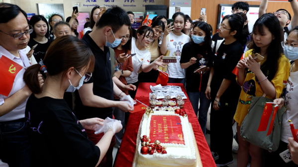 2021年7月1日上午8:00,管理学院全体师生党员、预备党员、“两优一先”代表、民主党派人士在第一会议室集中观看“庆祝中国共产党成立100周年大会”直播。收看结束后在一楼大厅举行庆祝建党百年的诗词朗诵和红歌会,管理学院工业工程专业学生为大家带来诗朗诵《沁园春.雪》、擒敌拳、《同一首歌》、《歌唱祖国》、《不忘初心》歌曲表演,师生代表共同庆祝党的百年华诞。随后,师生党员领取政治生日贺卡,一起切蛋糕,书写对党的祝福,共祝党的生日。最后,师生党员在《没有共产党就没有新中国》的歌唱声中,挥动着鲜艳的党旗、国旗,抒发永远听党话、感党恩、跟党走的坚定决心和自觉践行的信念,活动圆满结束。