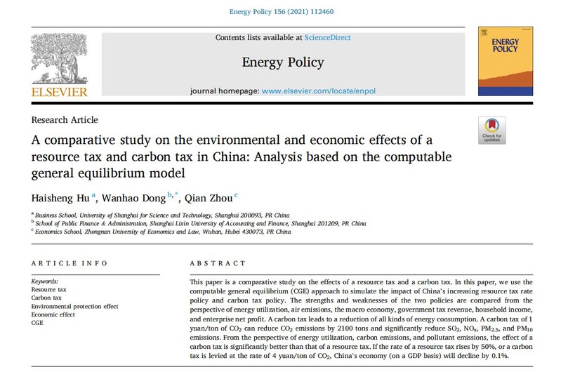 近日,我院青年教师胡海生在国际重要期刊《Energy Policy》上发表论文《A comparative study on the environmental and economic effects of a resourcetax and carbon tax in China: Analysis based on the computable generalequilibrium model》。