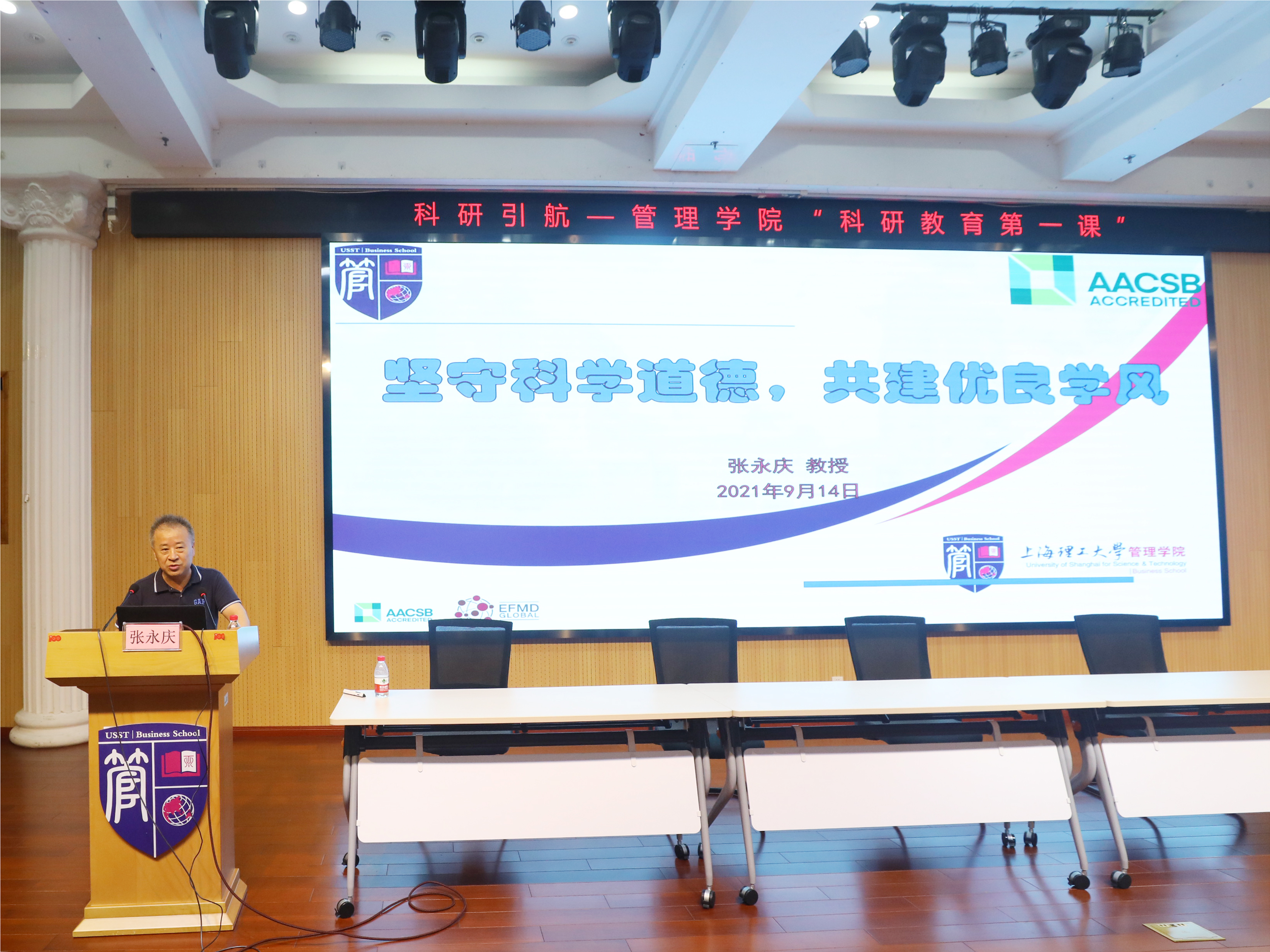 9月14日上午,管理学院在学院第一会议室开讲“2021级研究生科研导航第一课”,管理学院副院长张永庆教授应邀为2021级研究生新生作报告。该报告结合新生的科研启蒙教育,以“坚守科学道德,共建优良学风”为主题,为全体研究生新生系好科研道德的第一颗“扣子”。