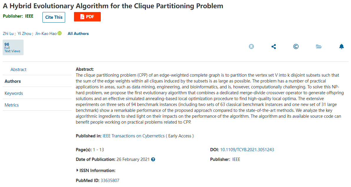 近日,我校管理学院青年教师陆芷在国际顶级期刊《IEEE Transactions on Cybernetics》上发表论文“A Hybrid Evolutionary Algorithm for the Clique Partitioning Problem (针对团分割问题的混合进化算法)”。该论文以乐鱼网页版为第一单位,陆芷老师为第一作者,电子科技大学周毅副教授和法国昂热大学Jin-Kao Hao教授为共同通讯作者。
