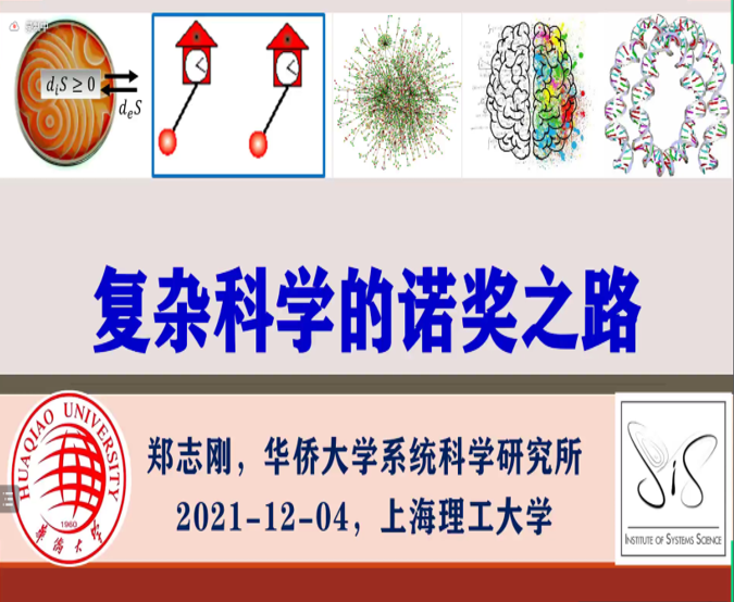本次讲座以郑志刚教授的报告 “复杂科学的诺奖之路”拉开序幕。郑志刚是华侨大学二级教授,荟萃计划特聘教授,福建省闽江学者、百人计划、高层次领军人才,系统科学研究所所长,博士生导师。长期从事复杂系统的统计物理与非线性动力学方面的研究工作,承担国家级项目20多项,近几年在国际刊物发表学术论文200余篇,专著5部,是复杂科学领域的知名学者。这次讲座他用简单通俗的语言沿着复杂科学的足迹,介绍了多层级生命复杂系统、地球复杂系统等,描绘了复杂科学的发展史;他指出,复杂科学的发展史是与其他学科不断交叉融合发展的过程,通过复杂系统研究获得诺贝尔物理奖可以看出复杂性科学“大有可为”,希望能再次看到复杂性科学获得诺贝尔奖,鼓励师生在复杂性科学领域做出更多贡献。