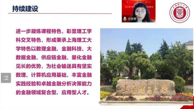 我院金融系的《金融学》课程负责人孙英隽教授,应中国高校金融教育金课联盟峰会邀请参加了大会,并在会上做了所申报的国家一流本科课程《金融学》的经验交流。我院《金融学》课程,2017年《金融学》被评为上海市重点课程,2018年上海市精品课程,2019年校级优质在线课程、课程思政领航课程,2020年获校级“课程思政优秀示范课程”,2021年由学校、上海市教委推送申报国家一流本科课程。