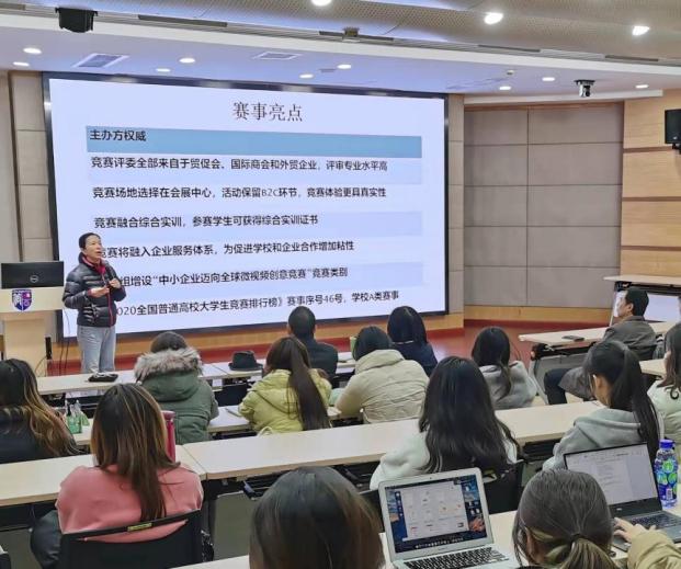 2021年12月30日,2022年全国商业精英挑战赛国际贸易专业竞赛(以下简称“国贸大赛”)宣讲会在乐鱼网页版四楼报告厅举行。国贸系主任罗芳教授、国际商务专业负责人魏景赋教授、系副主任秦炳涛副教授、系党支部书记何文老师、国贸大赛赛事主要负责人唐俏老师,指导教师团队赖红波老师、杨乐老师、周敏老师,以及60多名学生参加了此次宣讲会。会议由ITC国贸赛社陈川宁同学主持。