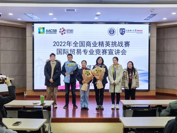 会中,参赛队伍队长代表全体参赛队员向国贸大赛全国总决赛的指导教师罗芳教授、唐俏老师和杨乐老师献花,并与莅临现场的各位老师合影留念。