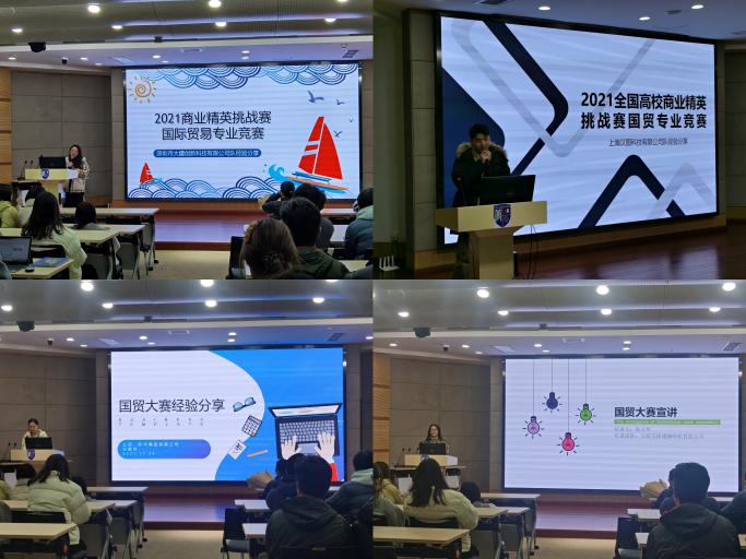 唐俏老师向参会师生全方位地介绍了国贸大赛,包括其已成为教育部A类赛事(赛事序号46)的通报,我校师生目前在上海市赛、国赛和世界总决赛中的获奖情况,参与该比赛部分往届学生的就业及升学情况等。随后,国贸大赛指导教师团队的其他各位老师,根据以往丰富的参赛经历,向现场同学做了详尽的赛事规则解析。