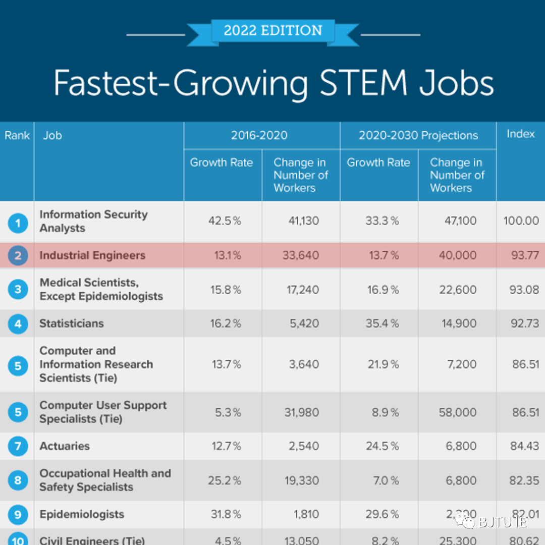 据SmartAsset公司最新发布的研究数据显示,工业工程专业的岗位在美国增长最快的科学、技术、工程、数学(以下简称“STEM”)岗位中排第二。美国劳动统计局预计未来十年美国将新增821,300个 STEM职位,增长比率约为9%。SmartAsset调查了美国成长速度最快的 STEM工作,通过四个指标对比了各个专业领域中的职位成长。这四个指标为:从2016到2020年就业岗位的增长率(percentage employment change)、增长数量(gross change in employment),从2020到2030年预计就业岗位的增长率、增长数量。