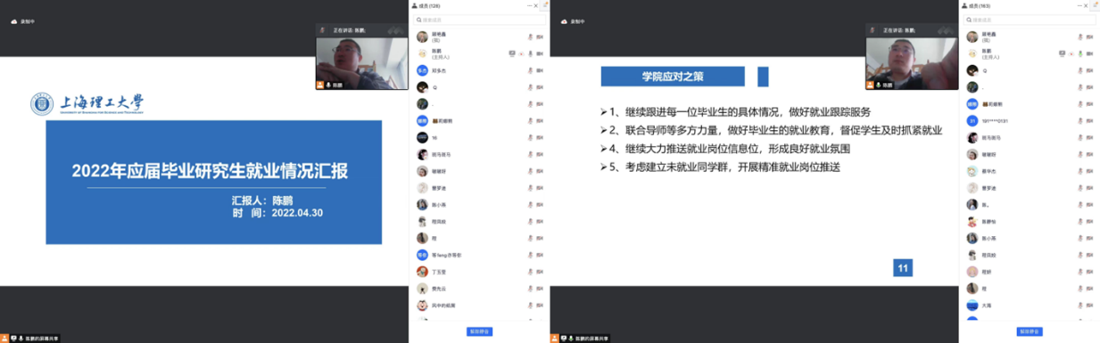 陈鹏老师首先通过ppt,对目前各专业的就业形势进行通报与分析。由于突如其来的疫情冲击以及封控管理的影响,对毕业研究生的就业进展造成的较大拖累,一个月以来,就业进展明显放慢,疫情前后的就业状况形成较大反差。对各个专业的未就业情况做了详尽的分类和分析,总结了未就业同学的主要原因,对这些同学下一步的就业计划提出了相关建议,并通报了学院有关的促进就业政策。