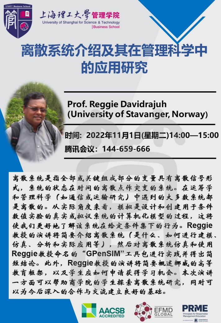 沪江经管论坛系列活动(第三十四期):离散系统介绍及其在管理科学中的应用研究 AN INTRODUCTION TO DISCRETE SYSTEMS AND ITS APPLICATION IN MANAGEMENT SCIENCES