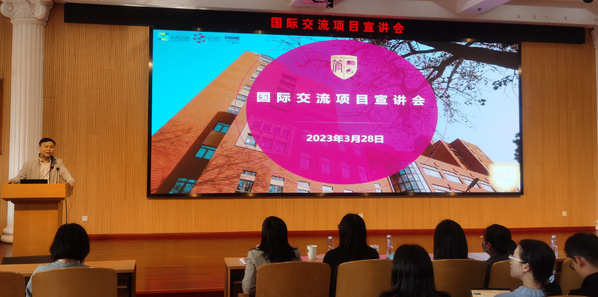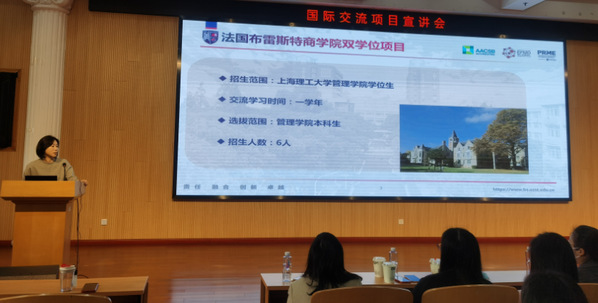 仲伟冰重点介绍了管理学院负责的院级交换生项目,包括法国布雷斯特商学院双学位项目和美国北达科他大学交换生项目。