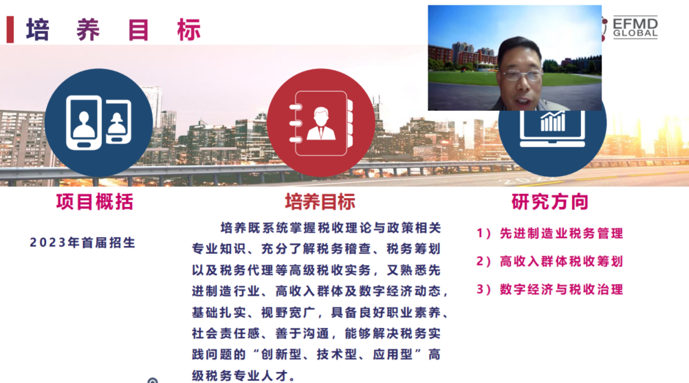 我校应用经济学学科带头人、税务专硕(MT)项目主任雷良海教授从学院、学科发展历史、重点研究方向、学科办学特色、就业前景等多方面对我校应用经济学的学科情况做了介绍,并宣传了我校税务专硕(MT)的发展历程、培养目标、项目特色及课程体系。