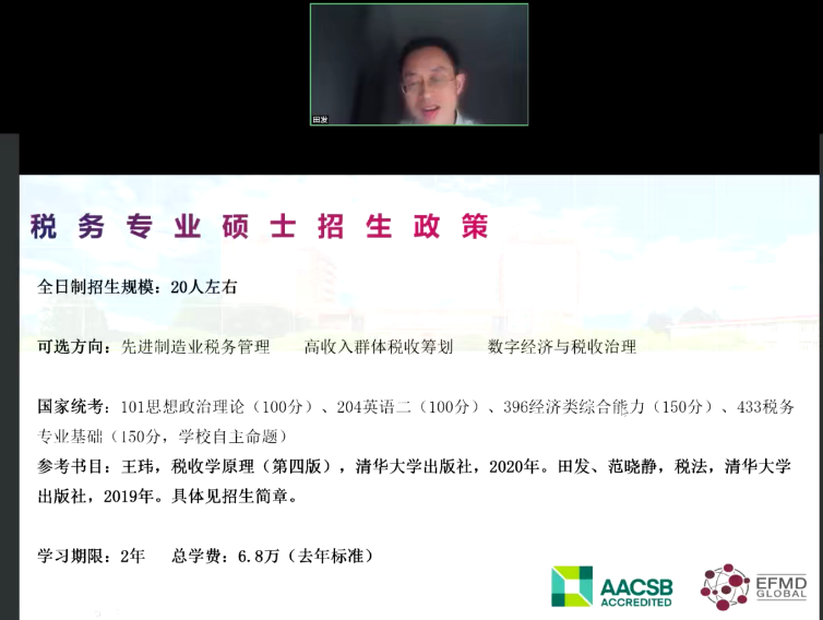 随后,财税系主任田发教授具体针对应用经济学科和税务专硕(MT)的招生政策、奖助学金政策以及考试录取情况进行了讲解。