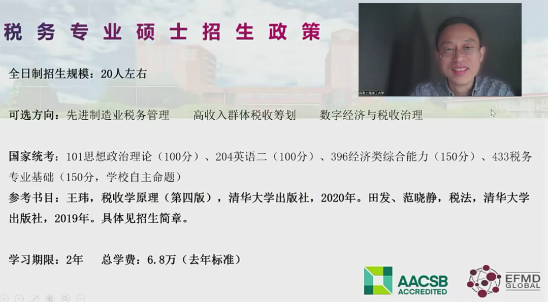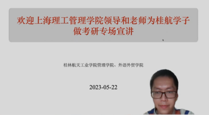 2023年5月22日,乐鱼网页版税务专硕(MT)和桂林航天工业学院管理学院、外语外贸学院联合举办的“2024年研究生招生宣讲会”线上举行。桂林航天工业学院管理学院财务管理教研室专业负责人杨宗翰副教授主持了此次宣讲会。来自桂林航天工业学院管理学院和外语外贸学院2020级的260余名学生参加了本次宣讲会。