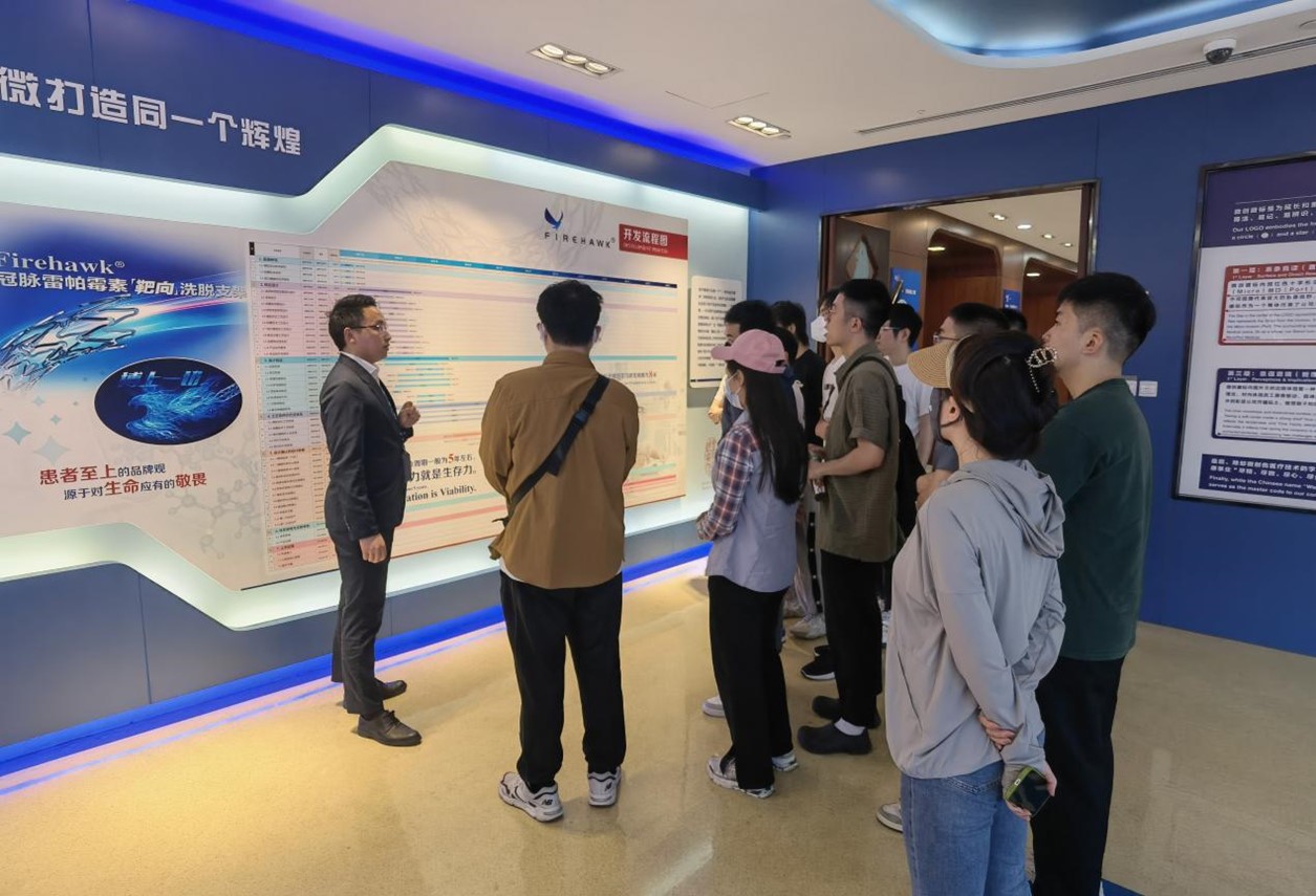 通过观看纪录影片,师生们对企业的25年来的发展历程、产品迭代、文化和社会责任有了进一步认识。上海理工大学校友带领大家参观集团的产品技术展示厅,近距离了解集团产品。同学们对Firebired2、Firehawk、PTCA球囊扩张导管、植入式心脏起搏器、髋关节产品、膝关节产品、鸿鹄骨科手术机器人、图迈腔镜手术机器人等一系列产品有了更直观认识。