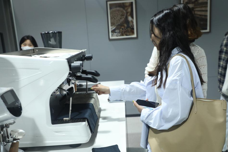展厅一角,陈列着不同口味的咖啡生豆,在工作人员引导下,同学们手捧豆子,闻其香气。有“老法师”现场冲泡香气四溢的卡布奇诺,展现拉花技艺。专业、时尚、潮流……这是一次与咖啡有关的文化之旅。大家纷纷点赞,留下专属评价。