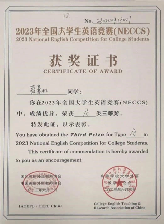 参加全国大学生英语竞赛对我来说是非常难忘的经历,这不仅仅是一场英语水平的竞技,更是对如何把握备考策略的一次考验。很高兴把握住这样的机会,这也将是迈向更高目标的起点。相比全国大学英语四、六级考试(CET),全国大学生英语竞赛题量大、题型多,十分考验参赛同学规划做题时间的策略水平。然而,大英赛含金量高,且相比较互联网+、挑战杯比赛也更容易获得荣誉,尤其对于文科来说是难能可贵的机会,想要落户、评优的同学更加需要关注。纸上得来终觉浅,绝知此事要躬行。语言作为交流工具需要在实践中不断积累才能日益增进,希望未来我们学位中心能有更多同学参与其中,再创佳绩,为自己,为学院增添光彩,不留遗憾! ——蔡景虹