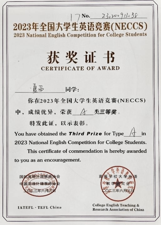 很荣幸在本次大学生英语竞赛中获得了三等奖,在此,与大家分享一些比赛过程中的经验。由于大家都经过了考研,英语水平相对接近。因此,我的备考主要集中在大英赛特有的听力和智力题等方面,日常进行练习。在比赛中,由于题量较大,须抓紧时间进行答题,在题目的时间分配上做出取舍,抓住容易得分的题目。无论比赛结果如何,相信每个人在准备比赛的过程中都会有所收获。坚持学习,不断提高自身的英语水平和能力,希望大家都能在比赛中取得优异的成绩。 ——夏苗