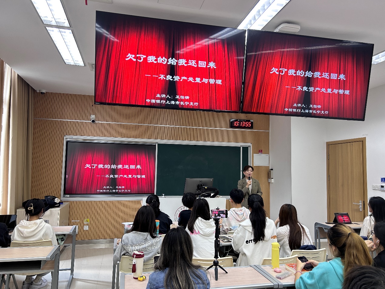 10月23日上午,中国银行上海市长宁支行普惠金融事业部王怡晴走进《商业银行业务与经营》的课堂,为管理学院金融专业本科生讲授不良资产处置与管理课程。金融系戈园婧老师及管理学院相关专业部分本科生、研究生等旁听了课程。