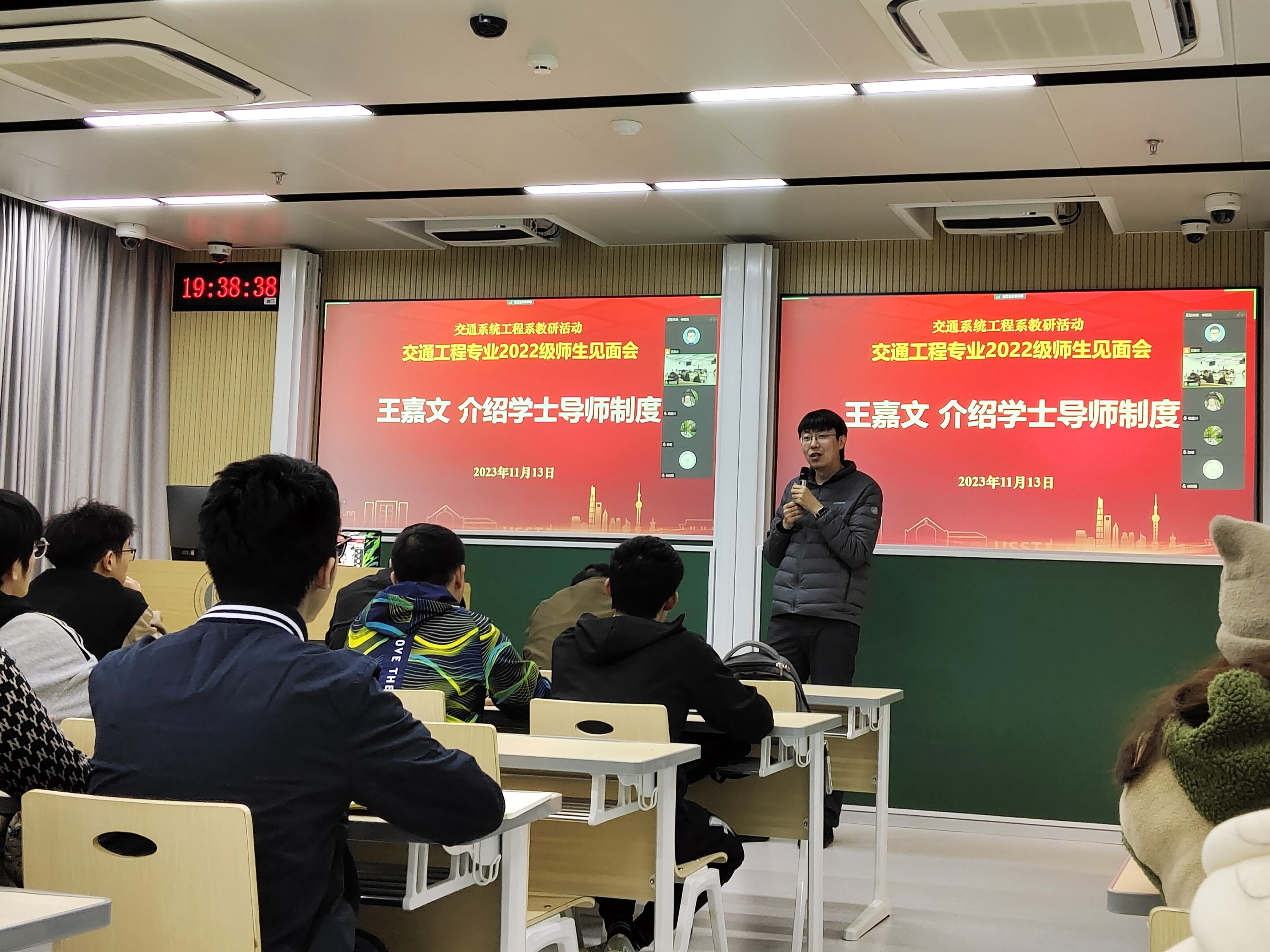 随后,王嘉文对学士导师制度及“师生双选”规则进行了详细介绍。在该规则下,老师与学生相互选择,并按照优先级进匹配,形成师生共同体,促进各类科创活动的开展。同时,他还从培养方向、专业支撑平台、就业去向及专业前景等方面介绍了我校交通工程专业的基本情况,并对同学们未来发展寄予了厚望。