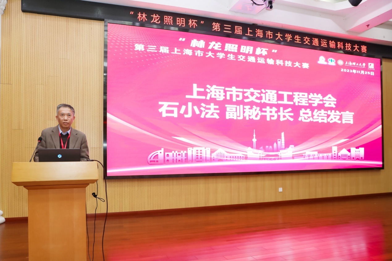 最后,上海市交通工程学会副秘书长石小法进行总结发言,他对参赛选手在交通科技创新领域所展现的成果和对未来交通发展的思考与探索表示了赞赏,并期待着未来看到更多优秀作品的出现。此外,他介绍了上海交通工程学会的历史和致力于推动交通工程领域发展和创新的使命。最后,他代表主办单位宣布第三届上海市大学生交通运输科技大赛圆满结束。
