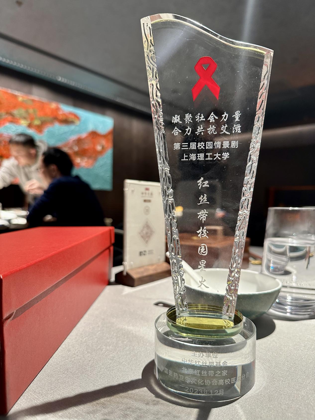 最终,来自64个院校的作品入围,经过第一阶段的网络投票与第二阶段的专家综合评审,共10个作品进入现场推优评比环节。上海理工大学作品《因“艾”生“恨”》取得了综合两个阶段的第一名,获得了中华红丝带基金授予的“红丝带校园星火”称号。第十届、十一届全国政协副主席、中华红丝带基金名誉理事长黄孟复为上海理工大学院校代表颁奖。上海理工大学作为该校园情景剧活动的常客,再次取得了优异的成绩,体现了上海理工大学对高校公益实践工作方面的高度重视。