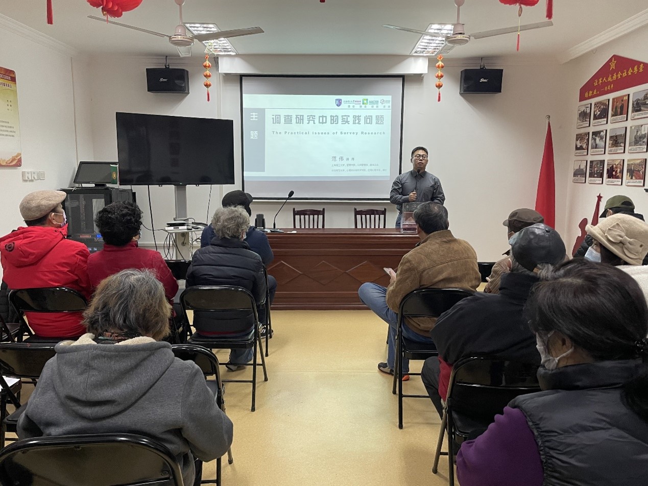 12月15日,公共管理系党支部组织委员范伟受邀参与长白新村街道图们路居民区党总支活动,并作题为《调查研究中的实践问题》的专题党课。长白新村街道图们路居民区党总支各支部成员60余人参与此次专题党课。本次党课由长白新村街道图们路居委会主任龚韡主持。