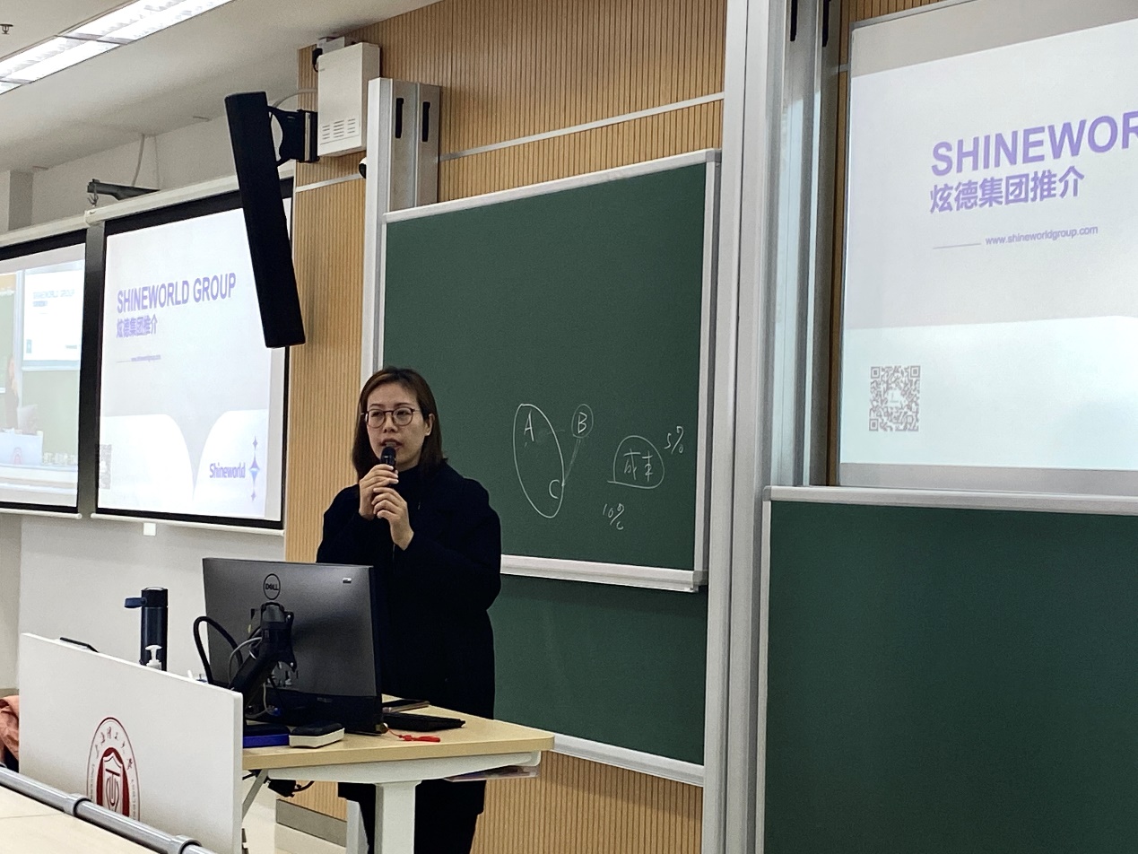 刘佳介绍了炫德集团的业务范围、企业文化和发展战略,并结合国际经济与贸易系的人才培养方向详细介绍了招聘岗位的职责要求、薪酬福利和发展空间等。