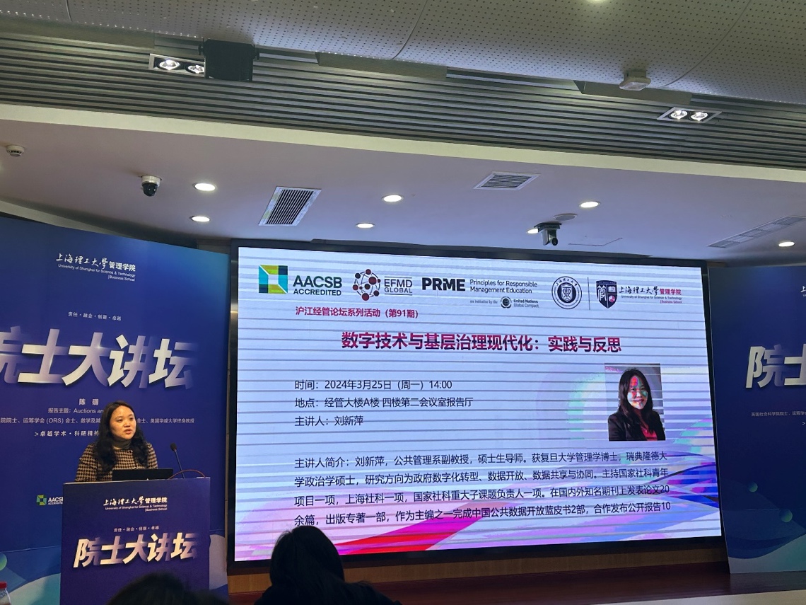 3月25日,沪江经管论坛系列活动第91期在上海理工大学经管大楼四楼第二会议室举行。管理学院公共管理系刘新萍副教授作题为“数字技术与基层治理现代化:实践与反思”的精彩报告。乐鱼网页版公共管理、管理科学与工程、系统科学研究生到场参与讲座。讲座由公共管理系李雅楠副教授主持并点评。