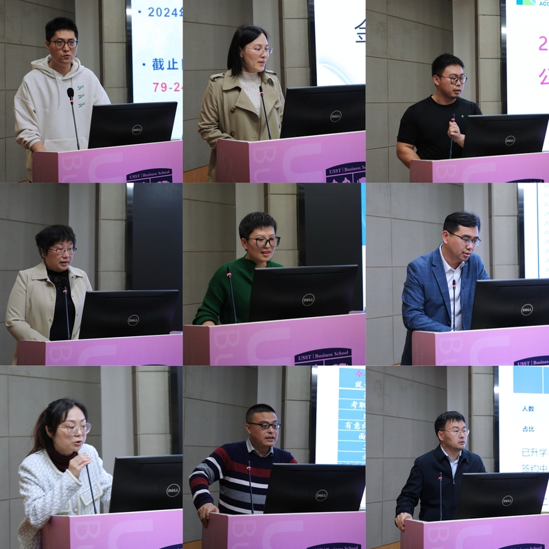 冯磊首先介绍了我校今年毕业生的基本情况和进度安排,蒲莹莹介绍了管理学院2024届毕业生整体就业情况、面临困难和后续推进措施。接着,各学科、各专业分别汇报了本专业毕业生就业情况,重点介绍了未就业学生情况及后续举措。