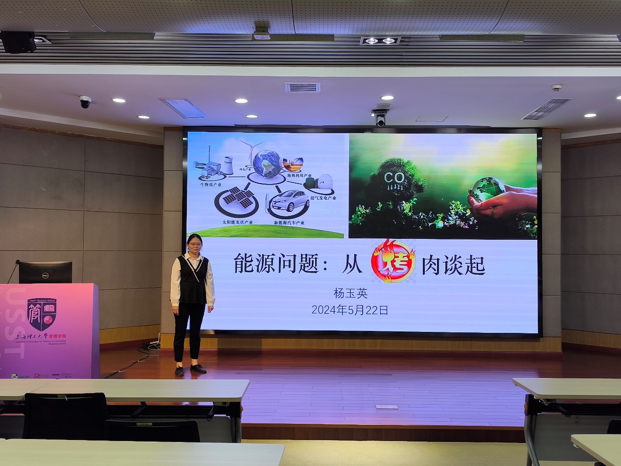 5月22日,沪江经管论坛第110期之青年学术沙龙在经管大楼A楼四楼第二会议室报告厅举办。工业工程系讲师杨玉英作题为“能源问题:从烤肉谈起”的学术报告。