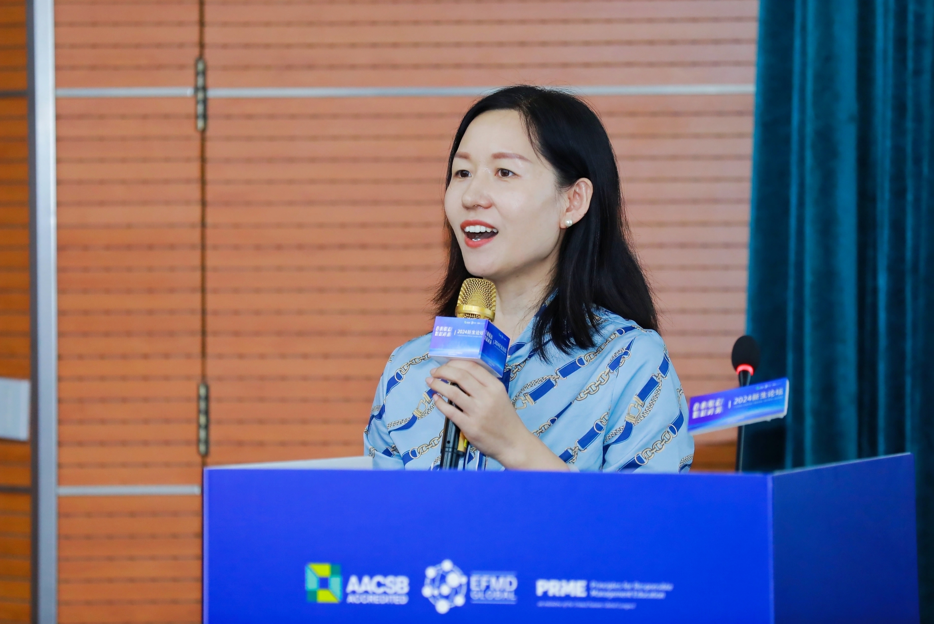 分享环节,管理学院教授、博士生导师耿秀丽以“新质生产力背景下的产业升级转型”为题,为现场嘉宾带来对新质生产力的前沿洞察。从生产力与社会发展的内在逻辑、新质生产力提出的背景、数据的驱动作用、产业转型升级案例四方面展开。2023年,新质生产力概念首次被提出,随着产业深度转型升级的需要,根据智能产品、用户行为等收集来的数据,成为转型的核心支撑。她总结,加快形成新质生产力,既是重要的战略机遇,也是推进中国式现代化建设的必然要求。