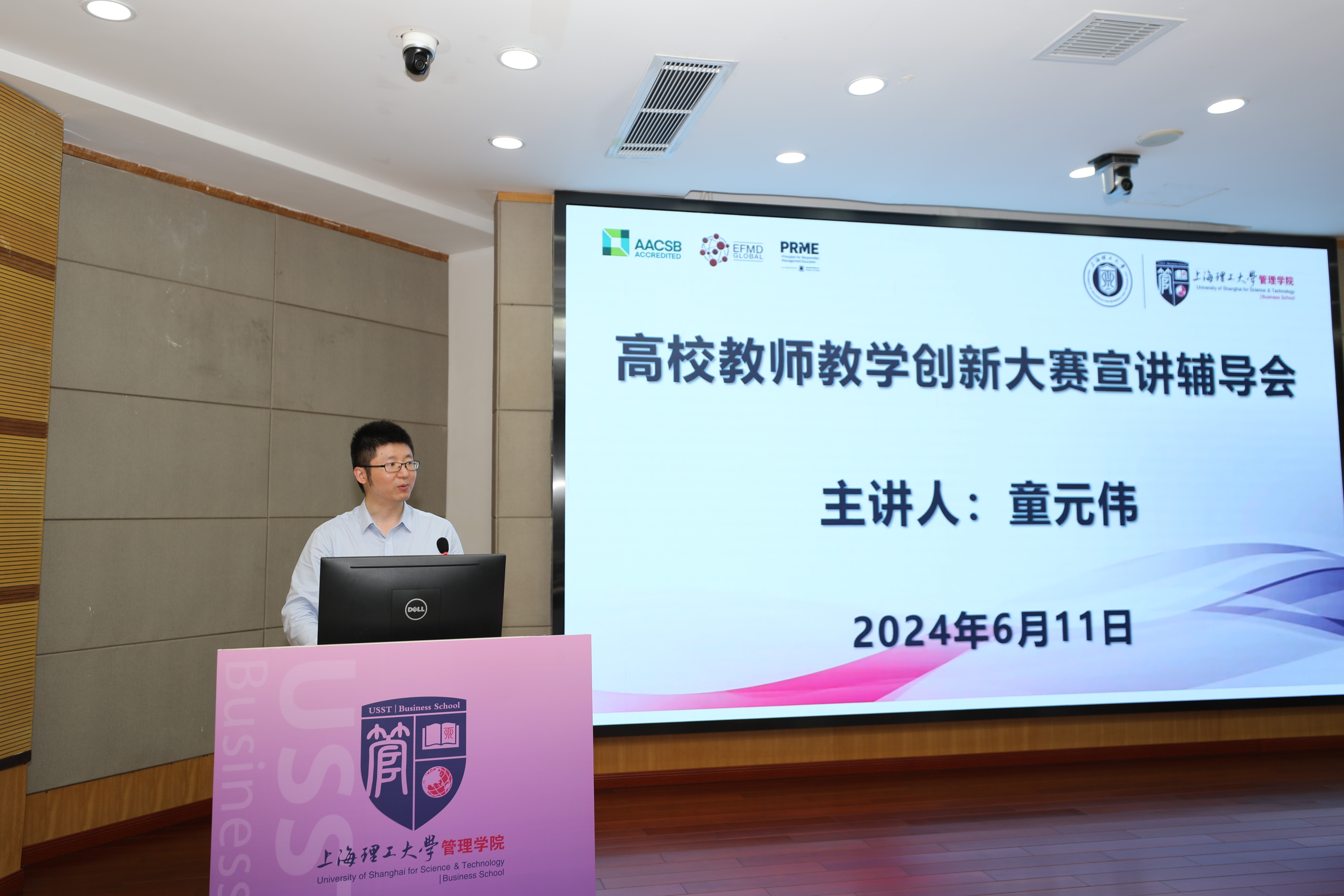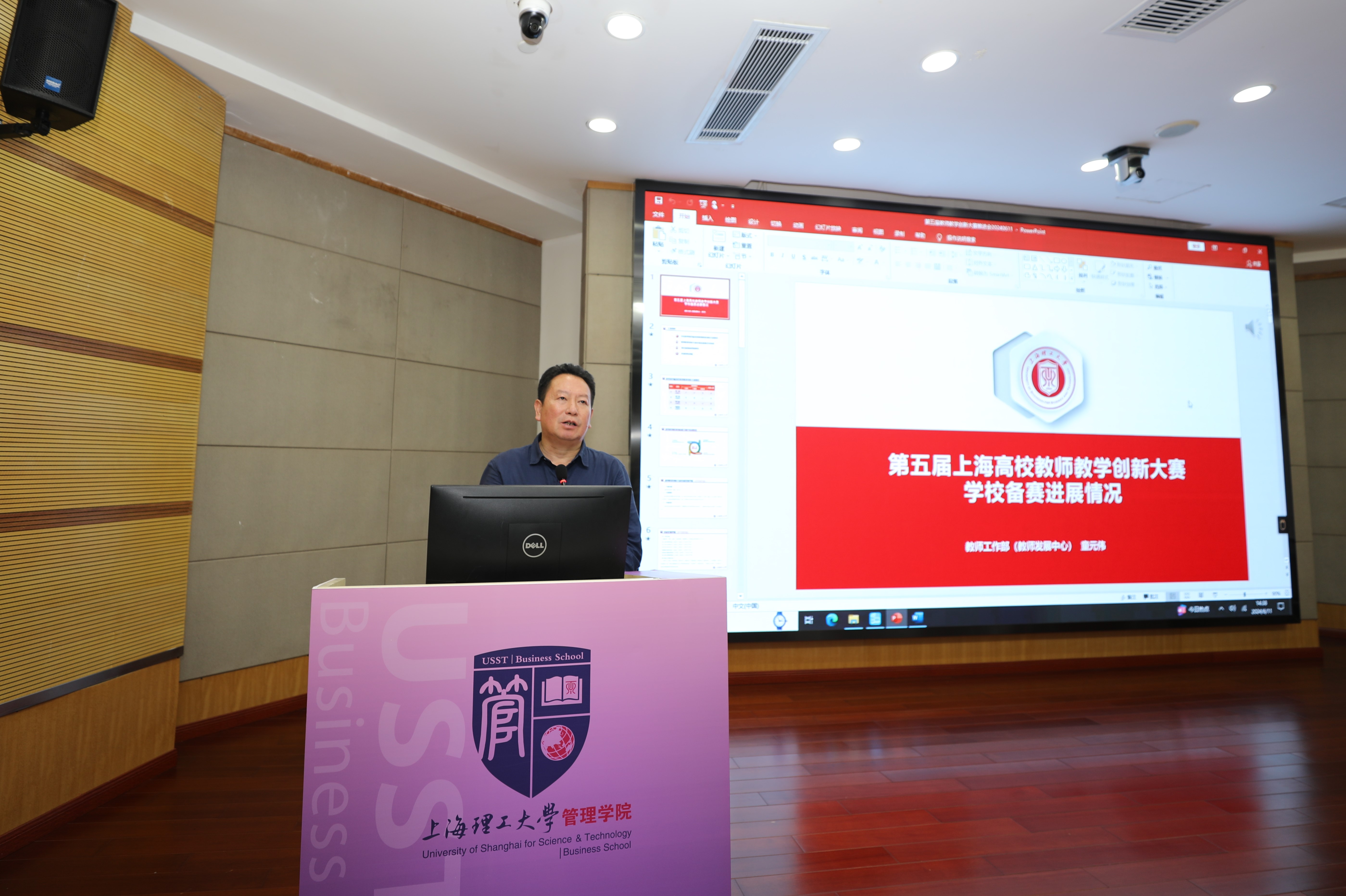 童元伟详细介绍了学校前四届高校教师教学创新大赛情况、教师教学创新大赛分组及赛事评分标准、第五届上海市高校教师教学创新大赛备赛进展情况以及参赛材料准备。他表示,管理学院拥有一批教学水平精湛、教学经验丰富的优秀教师,欢迎广大教师积极参加高校教师教学创新大赛。