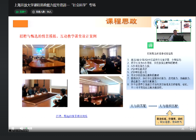 6月7日下午,为进一步提升上海开放大学课程思政建设质量,提高教师课程思政教学能力,助力课程思政教学设计比赛的开展,上海开放大学组织本校专兼职教师通过“线上+线下”形式参加葛玉辉教授作为主讲的“课程思政能力提升”培训,本次培训学校共有65名专兼职教师参与。