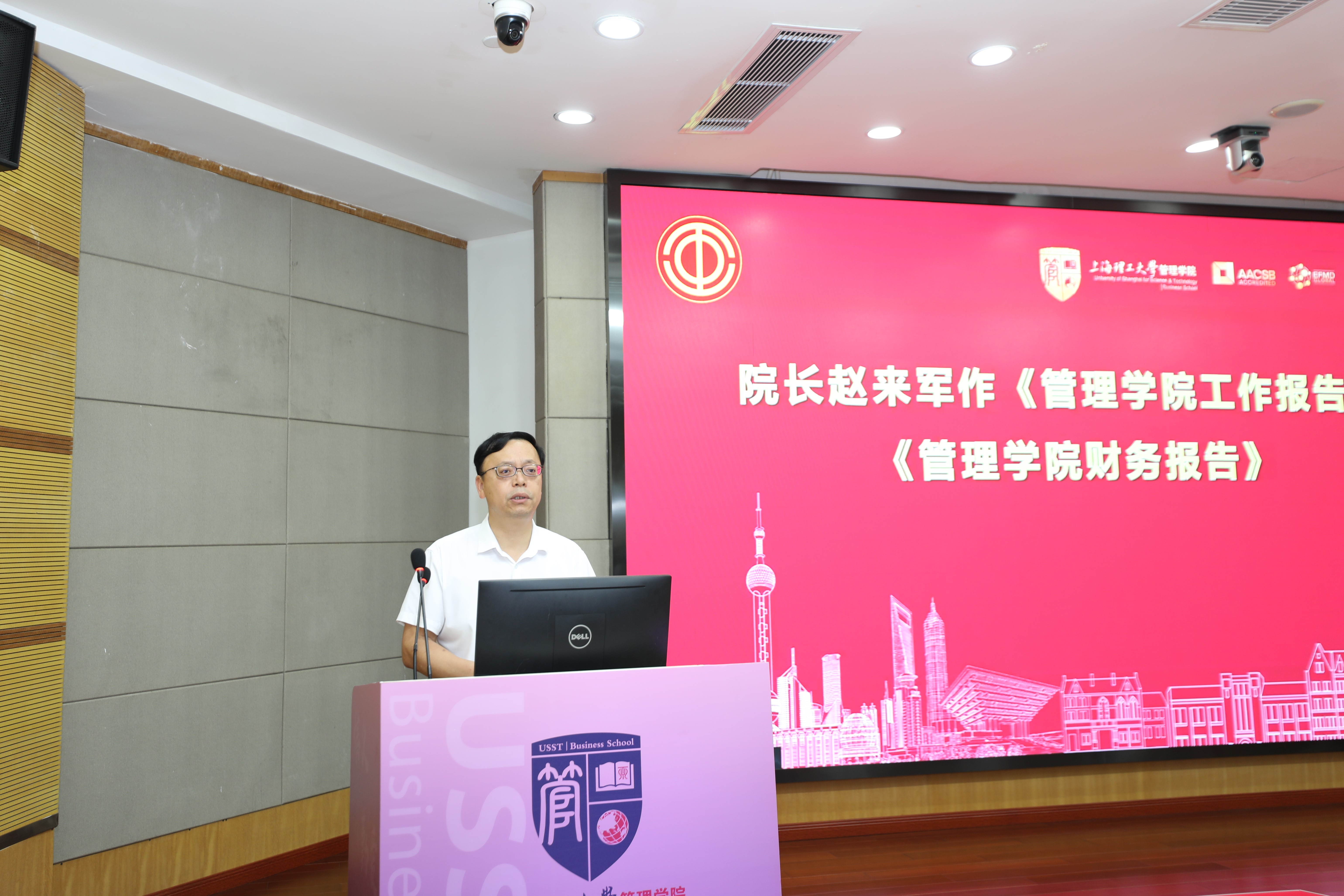 会议在庄严的国歌声中拉开帷幕。院长赵来军首先作学院工作报告和财务报告。他从发展战略、办学绩效考核、师资、国际化建设、学科建设、科学研究、人才培养、校政企合作、社会服务及影响以及财务收支等方面对以往学院工作进行了回顾总结,表示当前学院各项事业都取得长足进步,尤其是在科研、学科发展以及人才引进方面的成果更是显著。