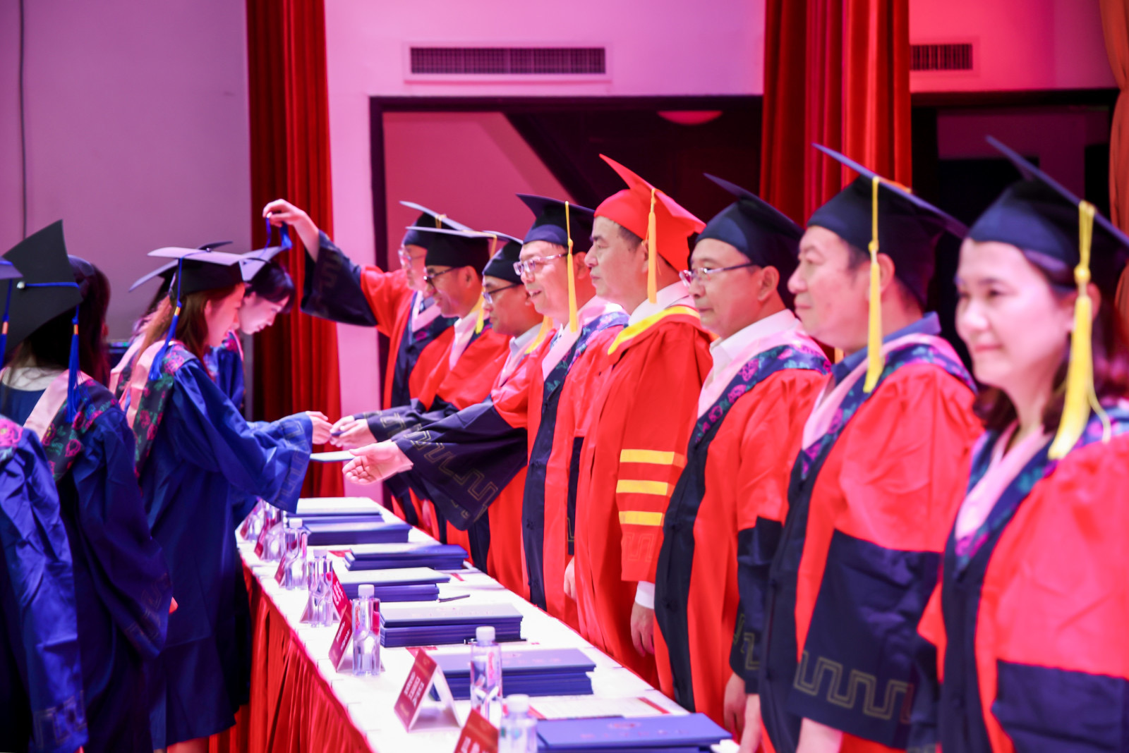 随后,拨穗仪式隆重举行。2024届毕业生依次上台由校领导、学院领导及导师代表为毕业生“拨穗正冠”。毕业生们学位帽上的流苏由右侧拨至左侧,标志着一个阶段的结束,更标志着整装待发,迎接新征程的开始。