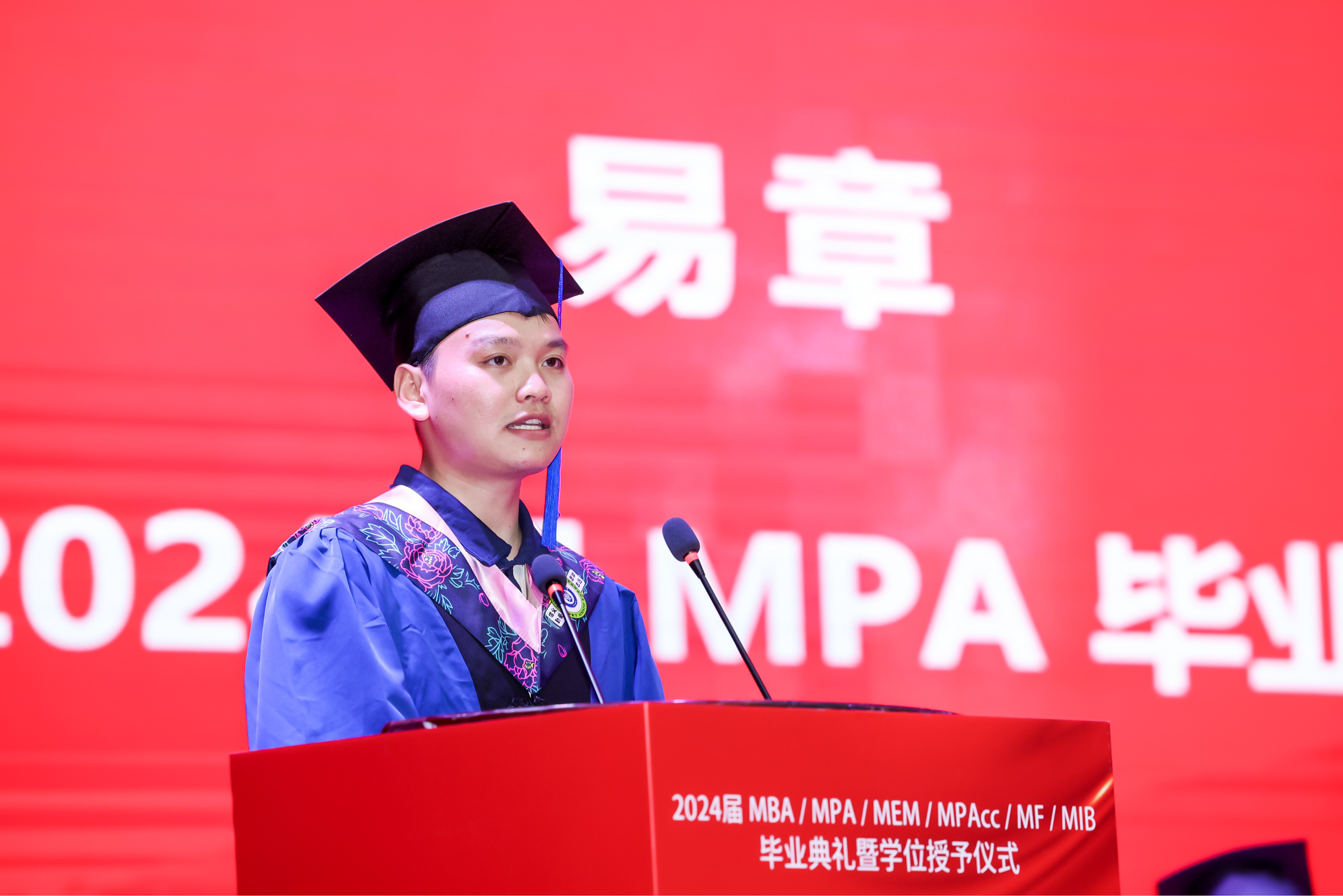 2024届MPA易章作为毕业生代表发言。他回顾了校园学习生活的点滴,从入学到毕业,每一次的学习、每一次的挑战,都是成长的足迹,收获了专业知识,拓宽了视野,也建立了深厚的同窗情谊,表示,未来,将带着这段宝贵的经历,继续前行,为公共事业和社会发展贡献自己的力量,努力实现人生价值和梦想。