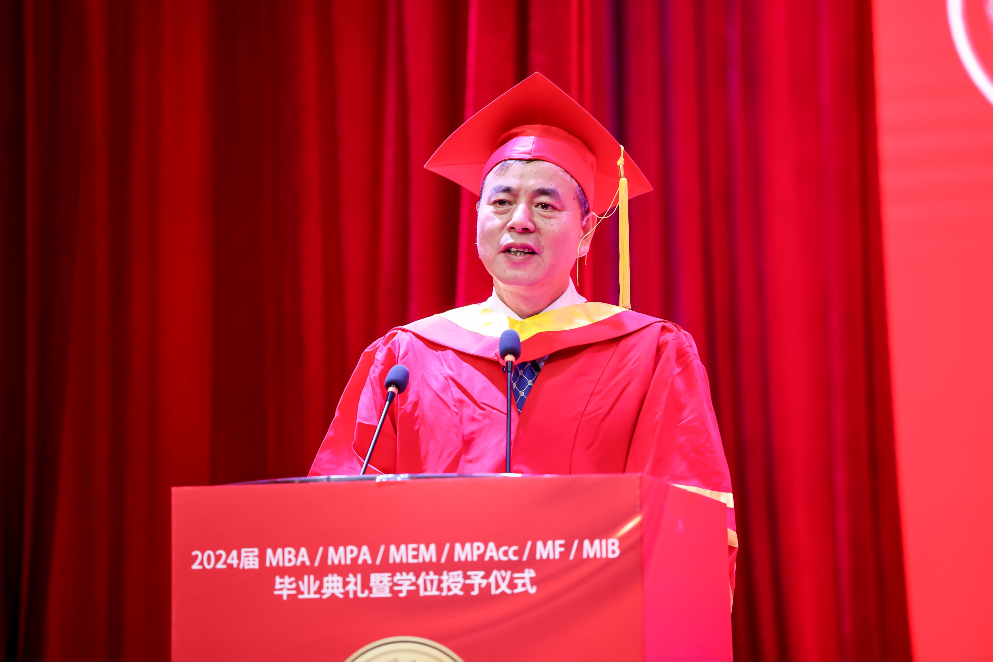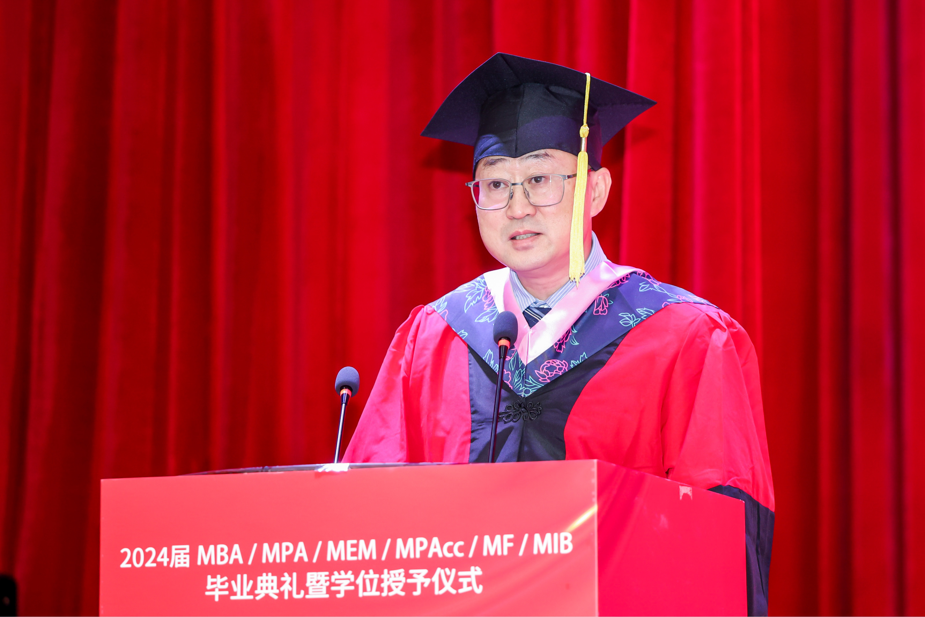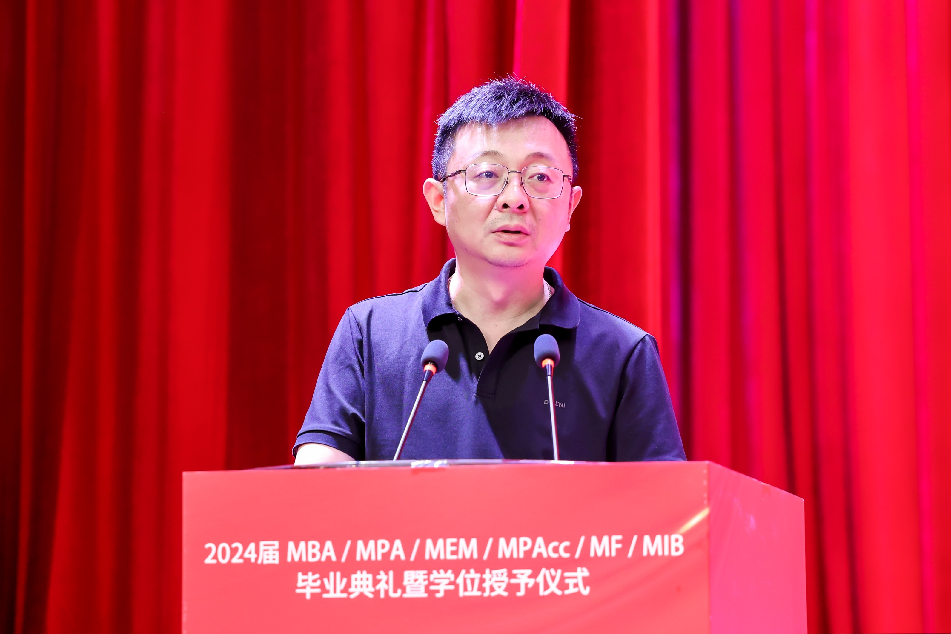 赵来军代表学院向完成学业,即将踏上新征程的毕业生们表示热烈的祝贺。他回顾了同学们过去两年的辛勤学习和取得的辉煌成绩,结合当前变革时代的挑战与机遇,以及管理学院的发展,向即将奔赴前程的同学们提出了几点希望:一是保持开放心态、勇于尝试;二是秉持诚信、勤奋和专业精神;三是与学院保持联系,共同为管理学院的进步贡献力量;四是不负青春,谱写属于你们的壮丽诗篇。