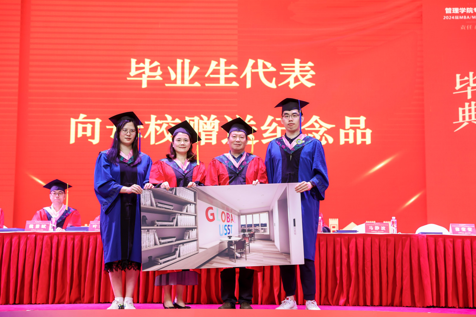 一份饱含毕业生们对学院美好祝愿的毕业礼物——用于中心学生们学习、互动、交流的PDEC学习空间,由毕业生代表上台赠给母校。马静波、蒲莹莹代表学校,接受毕业生代表向母校赠送的毕业礼物。同时,学院也向毕业生们送上了专属毕业礼物:一份学校“优秀历史建筑”徽章,一份刻有每位毕业生姓名的印章礼盒、最新上线的上理管院“小南瓜”IP表情包以及校友刊物“上理家园”,凝聚了大家在学校的独家记忆,也代表着学院对毕业生的美好祝愿。