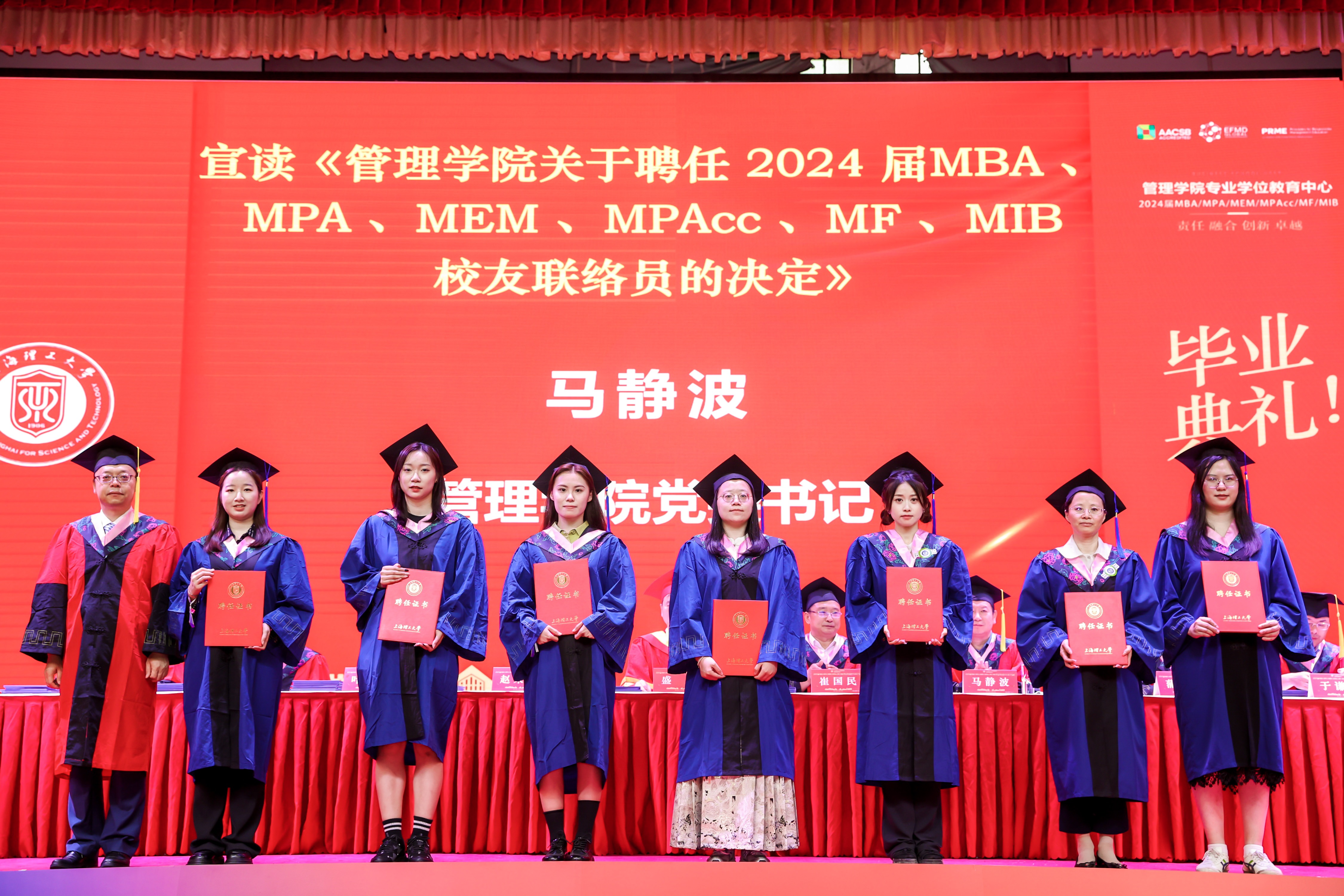马静波宣读《管理学院关于聘任2024届MBA、MPA、MEM、MPAcc、MF、MIB校友联络员的决定》。赵来军、马静波为2024届校友联络员颁发聘书,希望通过校友联络员,建立校友与学校、校友与校友之间更加广泛而密切的联系,更好地回应校友的关切,服务学校的发展。