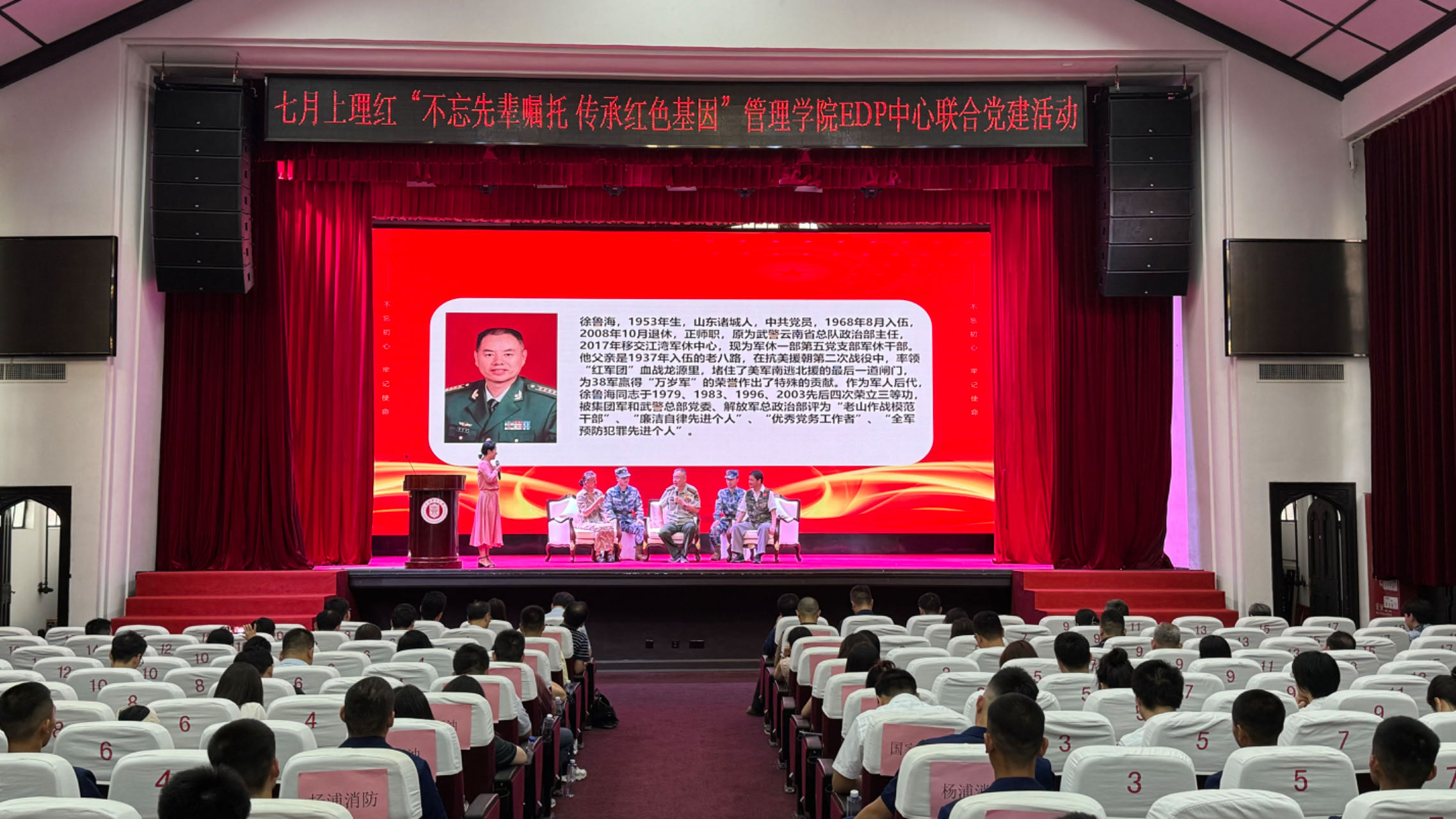 活动邀请了原武警云南省总队政治部主任、“老山作战模范干部”徐鲁海和参加过援越抗美战争的老战士沈宽深情地讲述了他们与战友共同经历的革命故事和英勇战斗的光辉事迹。这些曾在硝烟战火中淬炼过的老兵,用他们亲身经历的点点滴滴,深深触动了在场每一位听众的心弦。他们的传奇经历不仅唤醒了大家对国家深沉的爱,更点燃了每个人心中的爱国之火,更加坚定了大家继续前行、不懈奋斗的信念与决心。在这份深切的感动之中,所有人共同庄严宣誓,誓将继承老兵们的崇高精神,矢志不渝地守护并珍惜这用鲜血换来的和平年代。