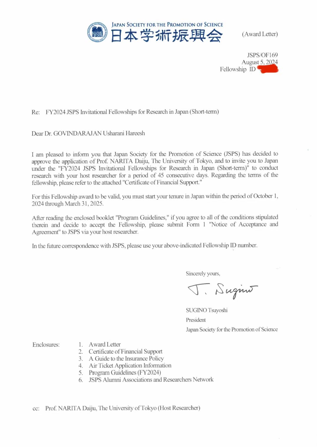 9月1日,日本学术振兴会(JSPS)发来正式授权信,管理学院教师Dr. GOVINDARAJAN Usharani Hareesh(中文名:何玄)获批2024-2025年度日本学术振兴会外籍聘用研究员项目(短期项目)。该项目的邀请合作方为日本东京大学的经济学教授Narita Daiju(成田 大樹)。