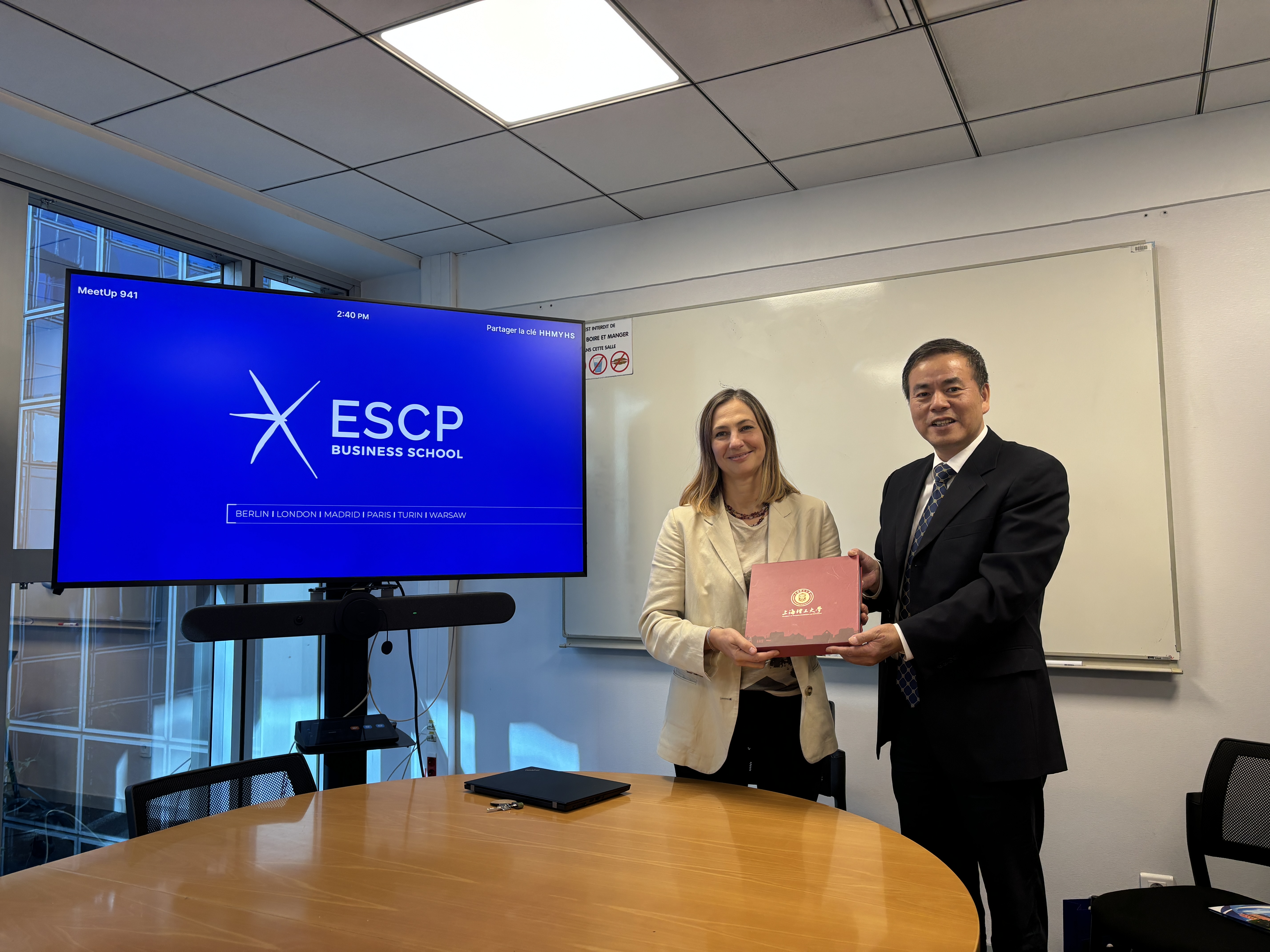 代表团首站抵达欧洲高等商学院,受到了该院国际关系部主任Marina Lecomte及大数据与商业分析系主任周炜教授的热烈欢迎。盛春与Marina Lecomte就商科教育、学生培养及师生互访等议题进行了交流探讨,并正式向周炜颁发了我校客座教授聘书。赵来军与周炜就商业大数据分析、中欧物流系统优化等学术问题进行了深入探讨。代表团还参观了校园设施,与学生和教师就课程质量、学习生活费用、未来发展等话题进行了友好交流。