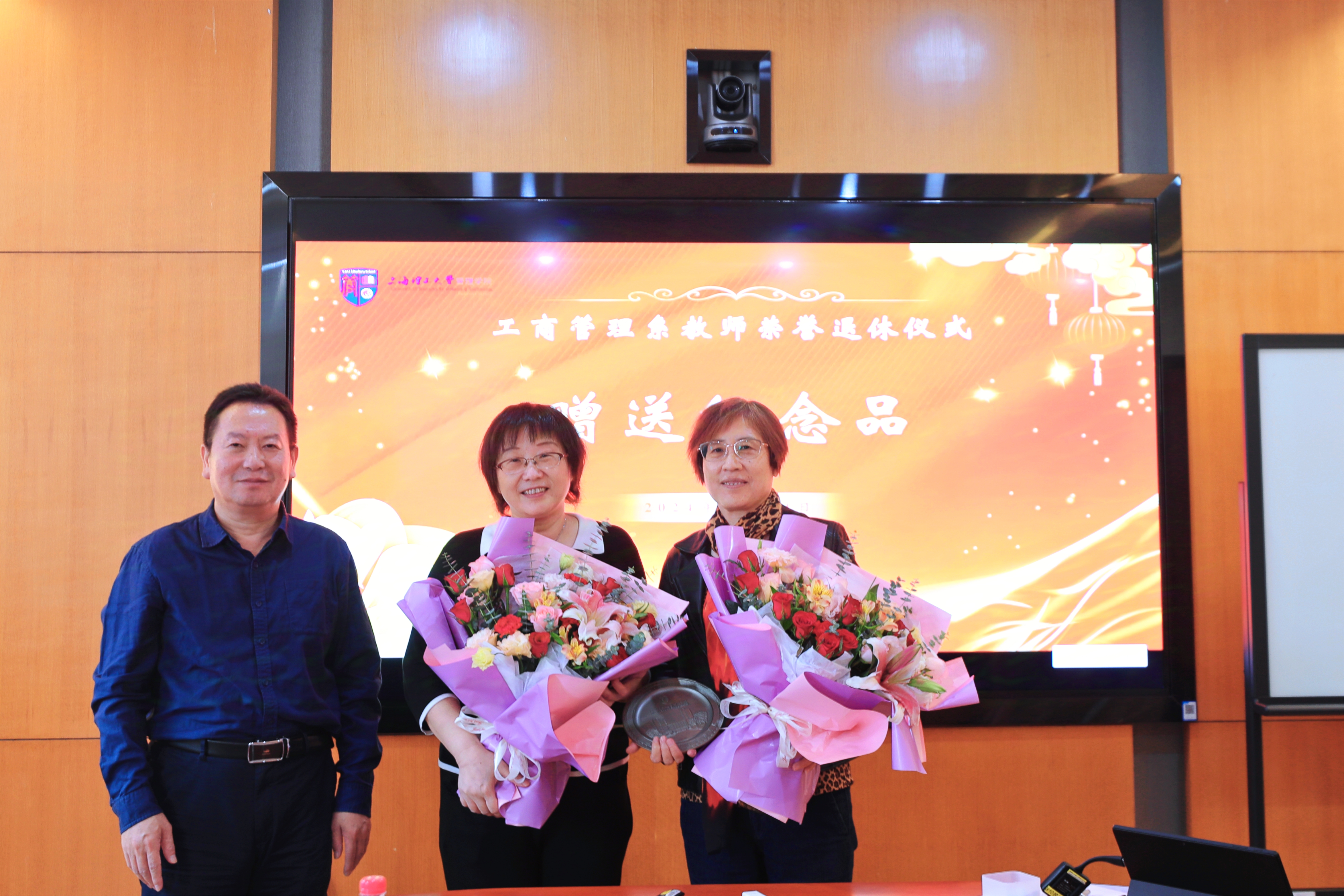 最后,马静波代表管理学院,葛玉辉代表全系向两位老师颁发了荣退纪念品,学生代表向两位老师献花,以表达对她们的深深敬意与美好祝愿。