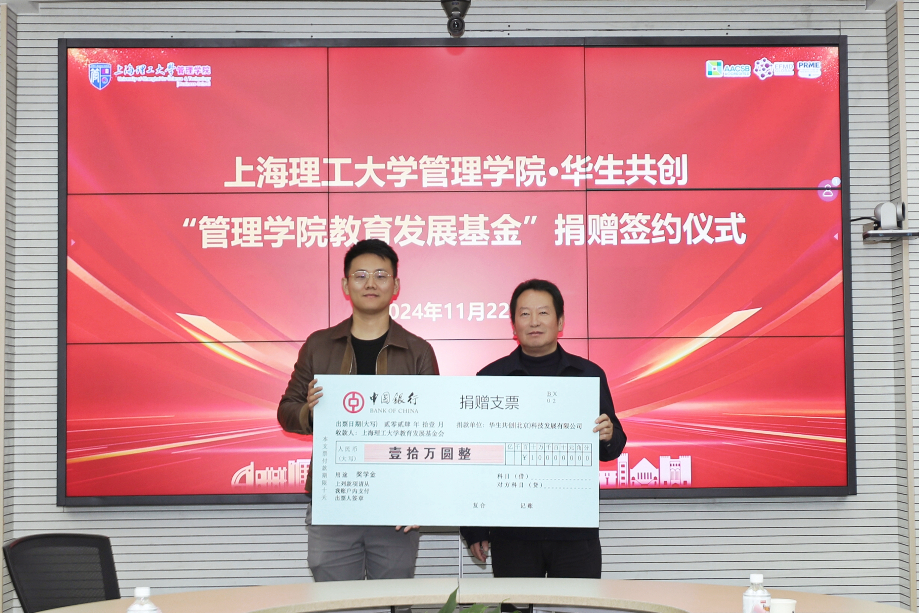 最后,马静波代表学校郑重接受了华生共创捐赠的“管理学院教育基金”支票,标志着此次捐赠仪式圆满成功。