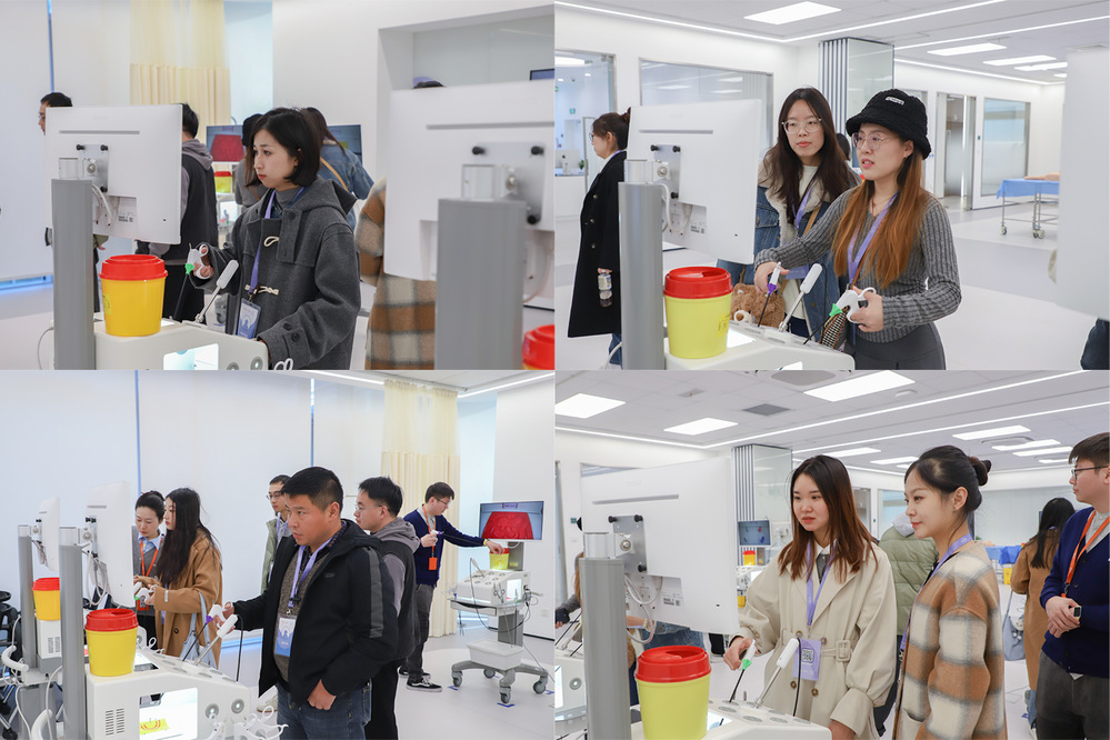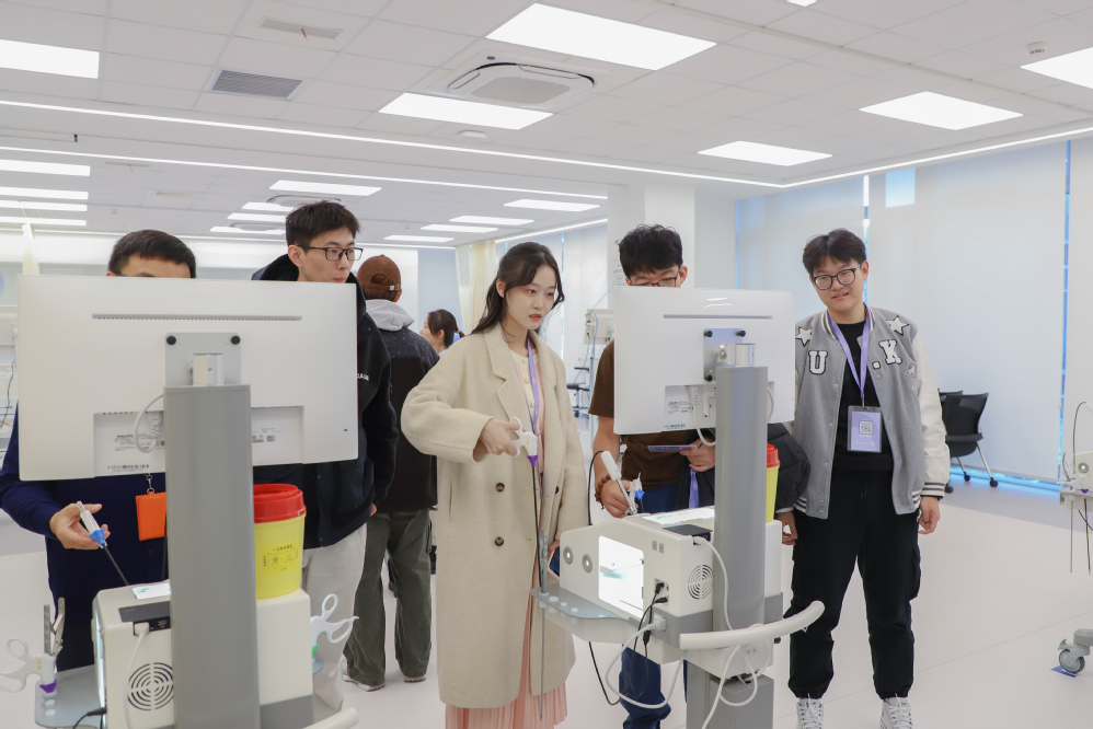 在创新中心模拟实验室,同学们亲身体验模拟腹腔镜手术操作,包括血管修剪和持针缝线等技术。大家热情高涨,踊跃尝试,深刻感受医学技术实践的独特魅力。在数字化创新中心的绿幕直播间,师生们化身医学知识“带货主播”,感受直播技术与医学知识结合的创新方式,深刻体会知识普及与科技赋能的紧密结合。